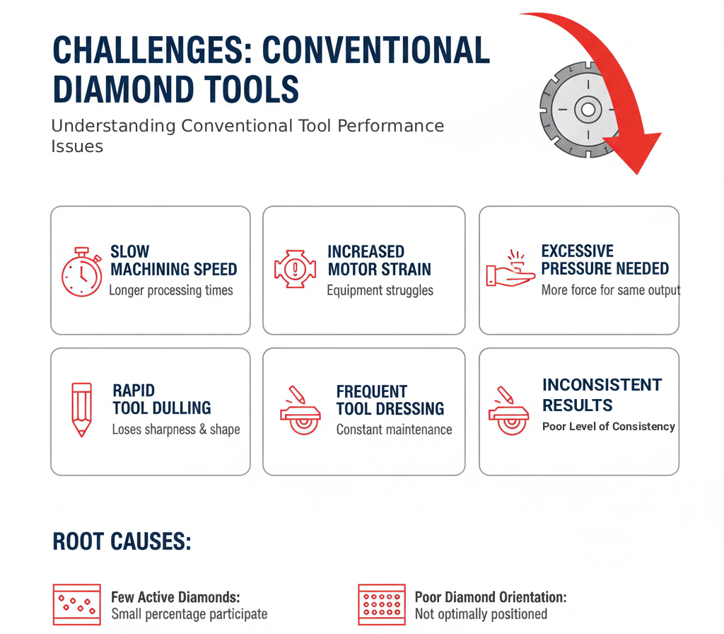 Most diamond & CBN tools (including conventional diamond / CBN tools) work fairly well when they are brand new. However, after some use the cutting speed begins to gradually tapper down. Some symptoms include: excessively longer cutting speeds, and machine motor bug downs. Increasing amount pressure & time is required to cut same amount of material. The cutting action may stop altogether, within further cutting requiring constant dressing in order to expose new diamond particles. Although initially the tool may appear full of diamonds, but in reality only a small portion of them is able to participate in the cutting action when and where needed at any given point in time.