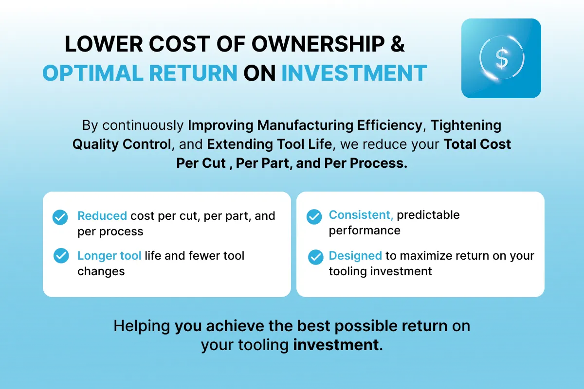By continuously Improving Manufacturing Efficiency, Tightening Quality Control, and Extending Tool Life, we reduce your Total Cost Per Cut, Per Part, and Per Process.