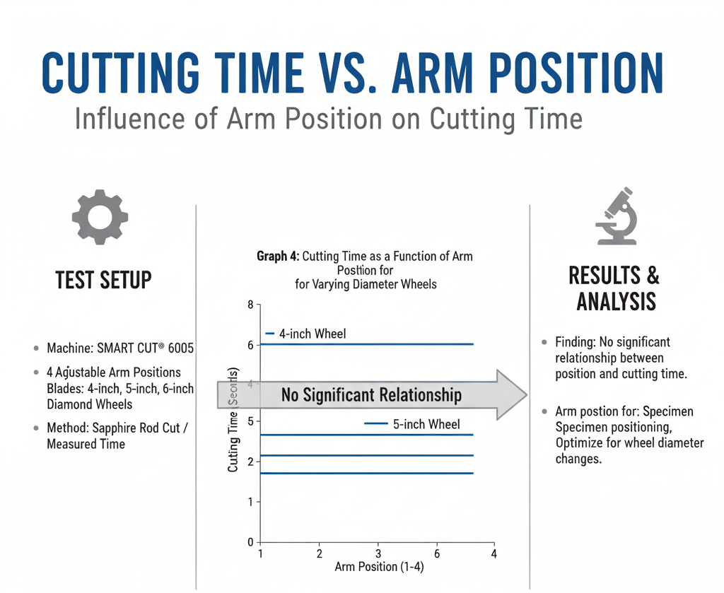 The data indicates no significant relationship between arm position and cutting time. Therefore, arm position adjustments should be primarily used for positioning the sample when changing wheel diameters or optimizing specimen placement.