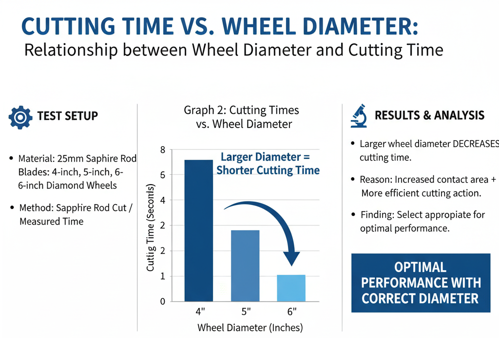The second set of experiments explored the effect of wheel diameter on cutting time. Using 4”, 5”, and 6” diamond wheels, the sapphire rod was cut, and the cutting times were measured.