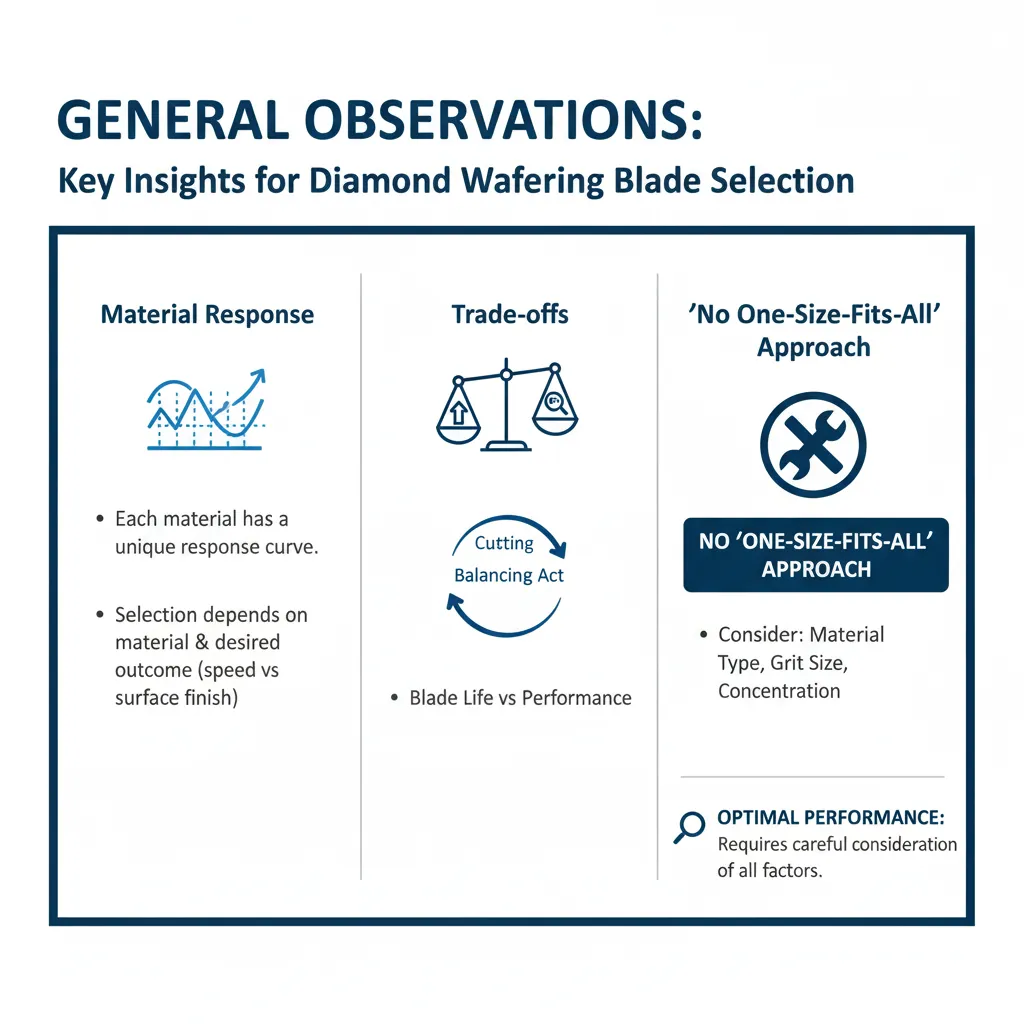 Each material has a unique response curve to different diamond wafering blade types, underscoring the importance of selecting the correct wheel based on both the material being cut and the desired outcomes (e.g., speed vs. surface finish).