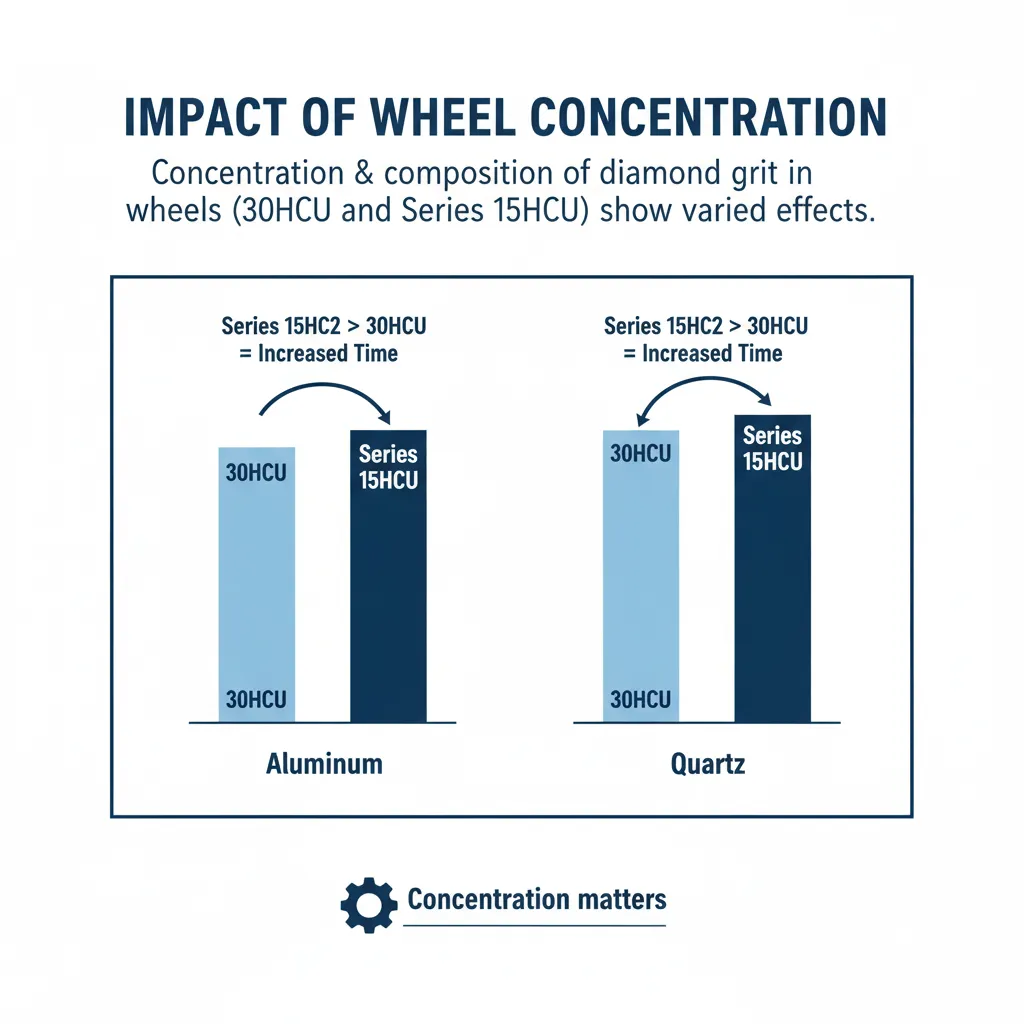 The concentration and composition of the diamond grit in the wheels (30HCU and Series 15HCU) show varied effects on different materials. For example, aluminum and quartz show an increase in cutting time with the Series 15HCU compared to 30HCU, indicating that the specifics of diamond concentration can significantly impact performance.
