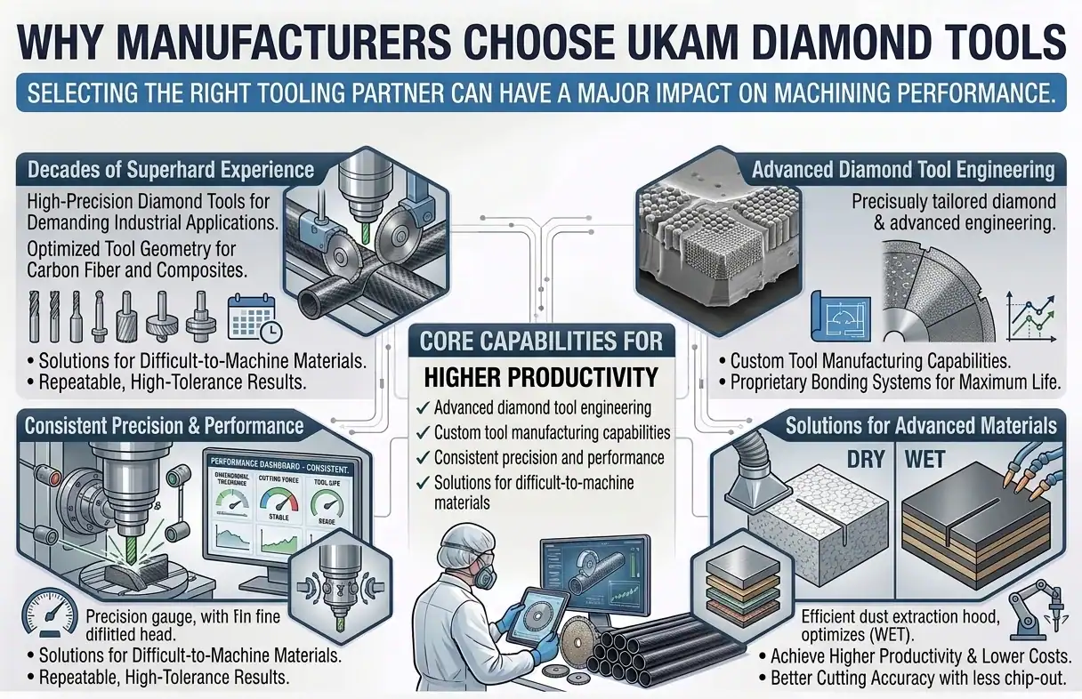 Companies such as UKAM Industrial Superhard Tools provide specialized tooling solutions for cutting advanced materials, including custom diamond blades designed specifically for composite machining.