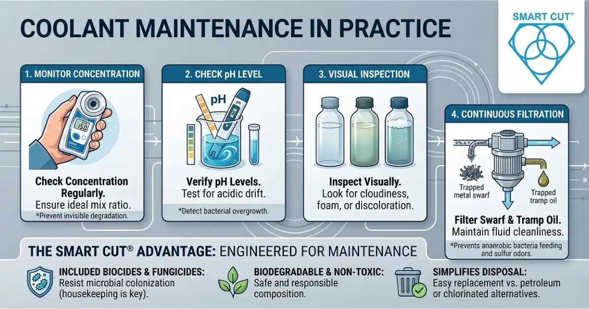 Monitor concentration with a refractometer regularly. Check pH for acidic drift caused by bacterial activity. Inspect visually for discoloration, foam, or cloudiness. Filter swarf and tramp oil continuously. Tramp oil feeds anaerobic bacteria that produce sulfur waste — the source of the rotten-egg odor in degraded sumps. SMART CUT® formulations include biocides and fungicides to resist microbial colonization, but they are not a substitute for good housekeeping.