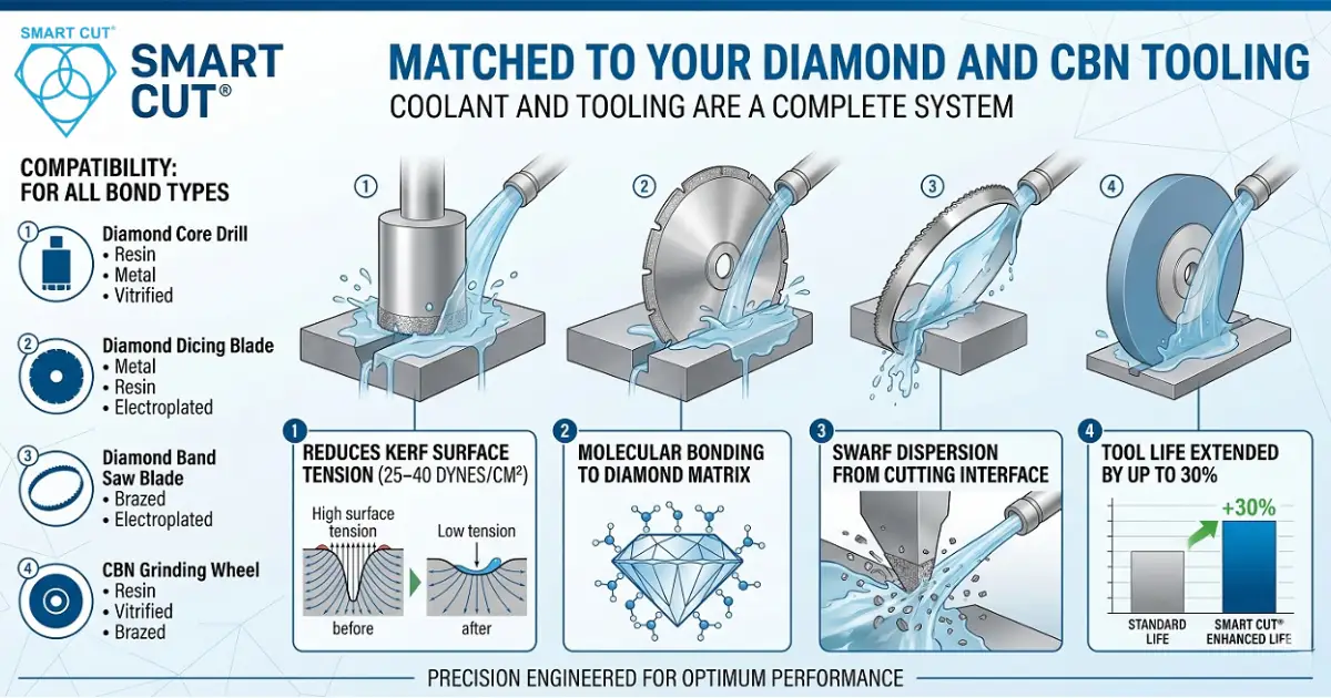 When paired with our diamond and CBN wheels, diamond dicing blades, diamond core drills, and diamond band saw blades, SMART CUT® reduces kerf surface tension by 25–40 dynes/cm², bonds water molecules to the diamond matrix, disperses swarf from the cutting interface, and extends tool life by up to 30%.