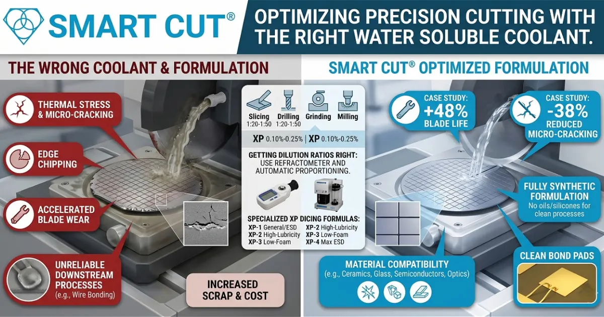 When your water soluble coolant is contaminated, wrongly concentrated, or mismatched to your material, damage compounds quickly. Thermal stress creates sub-surface micro-cracks. Edge chipping increases. Blade wear accelerates. In semiconductor dicing, poor coolant chemistry causes oxide formation on bond pads — making wire bonding unreliable downstream.