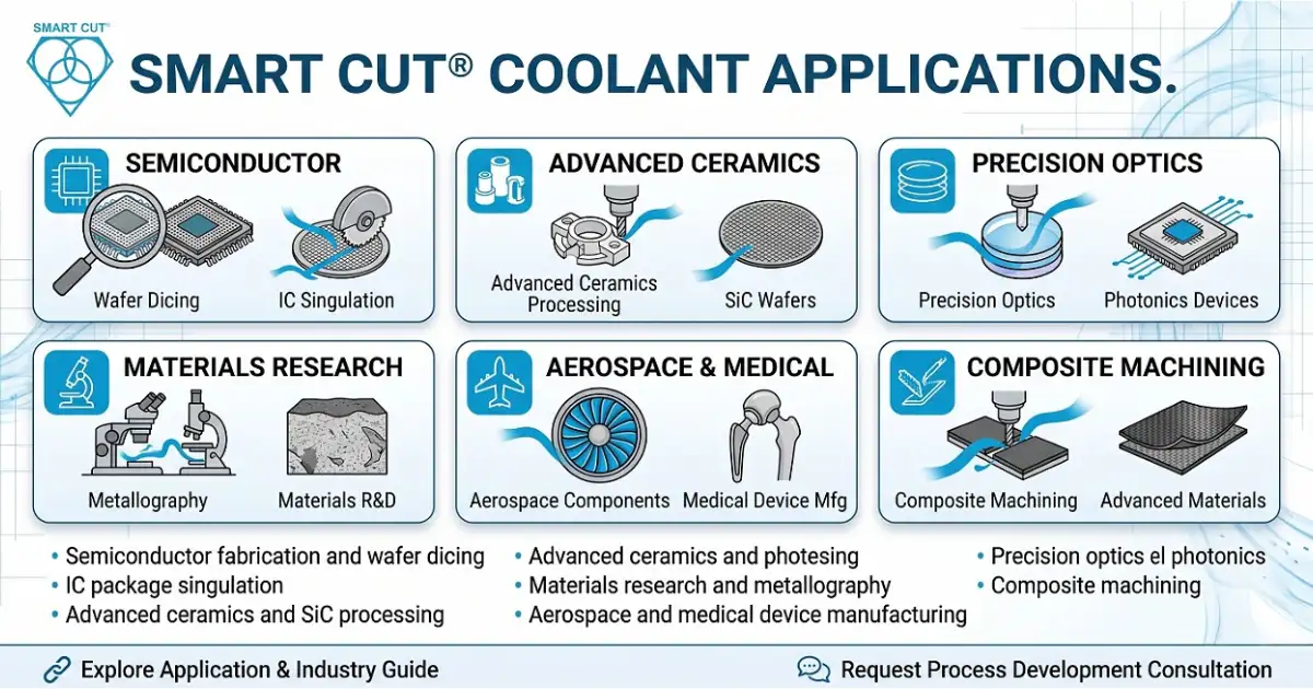 SMART CUT® water soluble coolants serve: semiconductor fabrication and wafer dicing, IC package singulation, advanced ceramics and SiC processing, precision optics and photonics, materials research and metallography, aerospace and medical device manufacturing, and composite machining. For application-specific guidance, visit our application and industry guide or request a process development consultation.