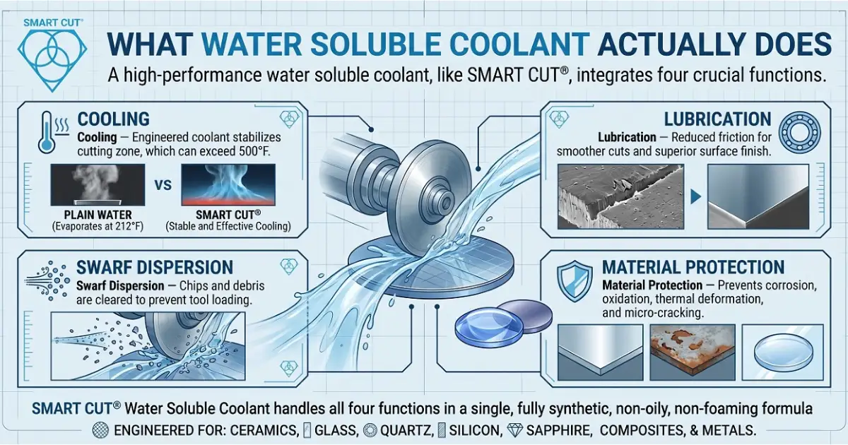 SMART CUT® Water Soluble Coolant handles all four functions in a single fully synthetic, non-oily, non-foaming formula engineered for ceramics, glass, quartz, silicon, sapphire, composites, and metals.