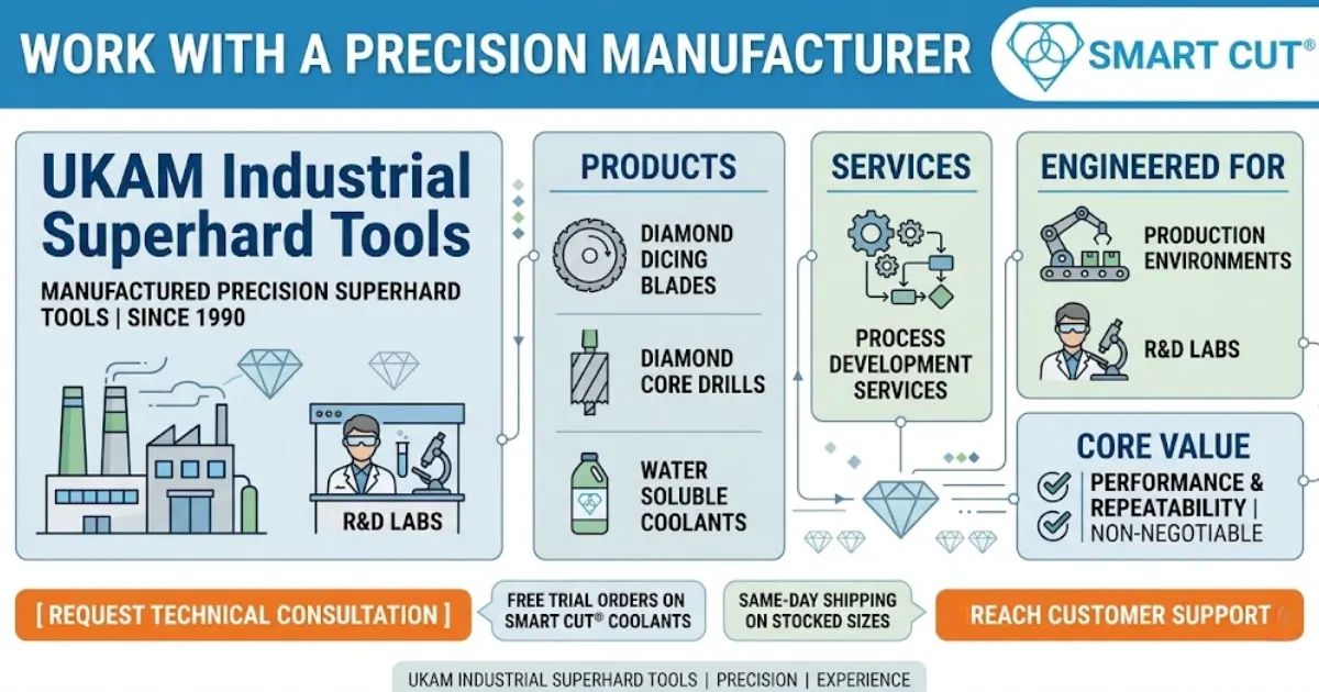 UKAM Industrial Superhard Tools has manufactured precision superhard tools since 1990. Every product — from diamond dicing blades and diamond core drills to water soluble coolants and process development services — is engineered for production environments and R&D labs where performance and repeatability are non-negotiable.
