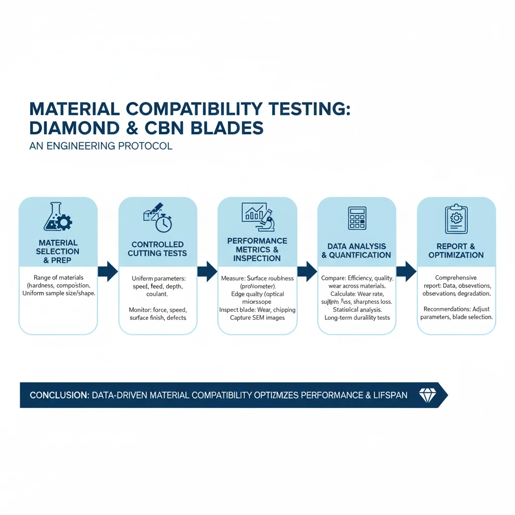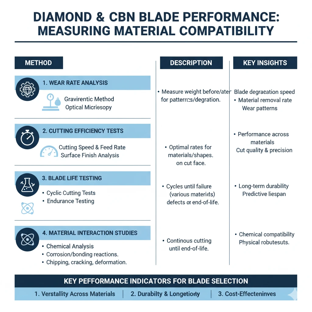Material compatibility is a critical factor in the performance of diamond and cubic boron nitride (CBN) cut-off blades. The ability of a blade to handle different types of materials effectively without degradation determines its versatility and longevity, particularly when working with a variety of material types and shapes. This section outlines the primary techniques and methods used to measure material compatibility, providing valuable insights into the performance and durability of cutting blades across diverse materials and geometries.
