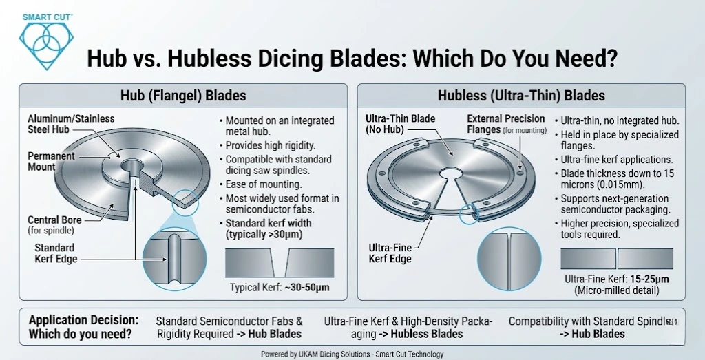 Another critical specification decision when sourcing diamond dicing blades for semiconductor applications is whether to use hub (flanged) or hubless blades.