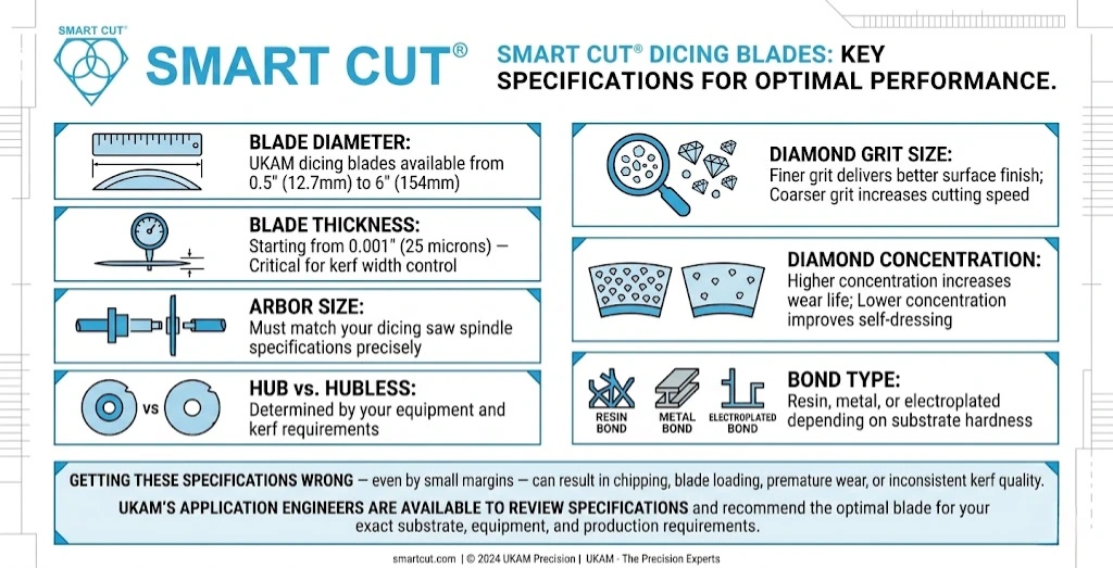 The key variables are your substrate material and hardness, required kerf width, acceptable chipping level, blade life expectations, and dicing saw equipment. UKAM offers a free application consultation where our engineers review these parameters and recommend the exact blade specification for your process. Contact us to request yours.