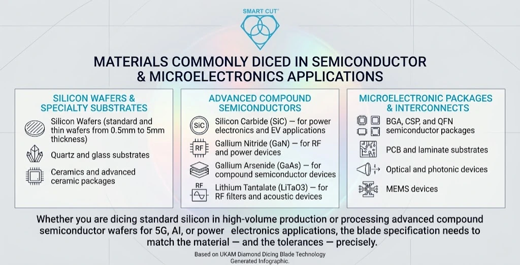 UKAM’s diamond dicing blades are used across a wide range of semiconductor and microelectronics substrates, including: