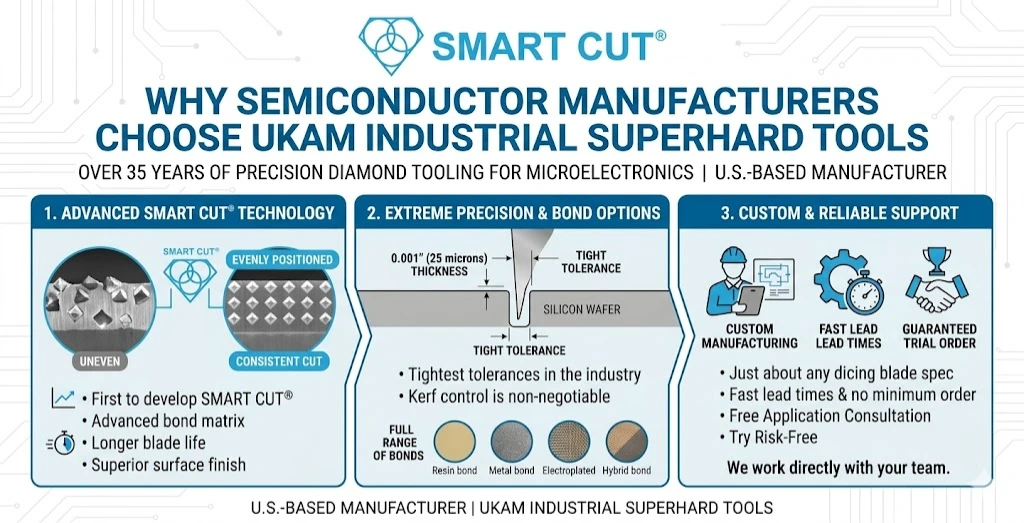 UKAM Industrial Superhard Tools is a U.S.-based manufacturer with over 35 years of specialization in precision diamond tooling for semiconductor and microelectronics applications. Here is why procurement teams and process engineers continue to choose UKAM: