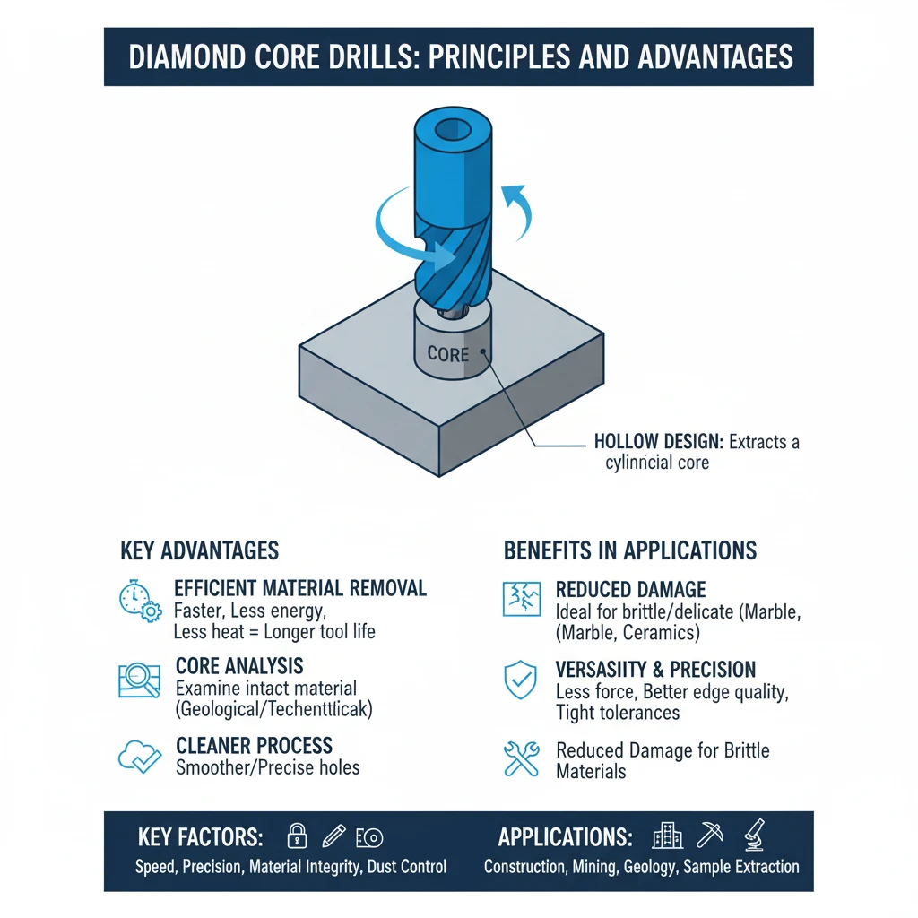 One of the primary advantages of diamond core drills is their efficient material removal. Since the core drill extracts a cylinder rather than grinding the full volume, the process is faster, requires less energy, and produces less heat.