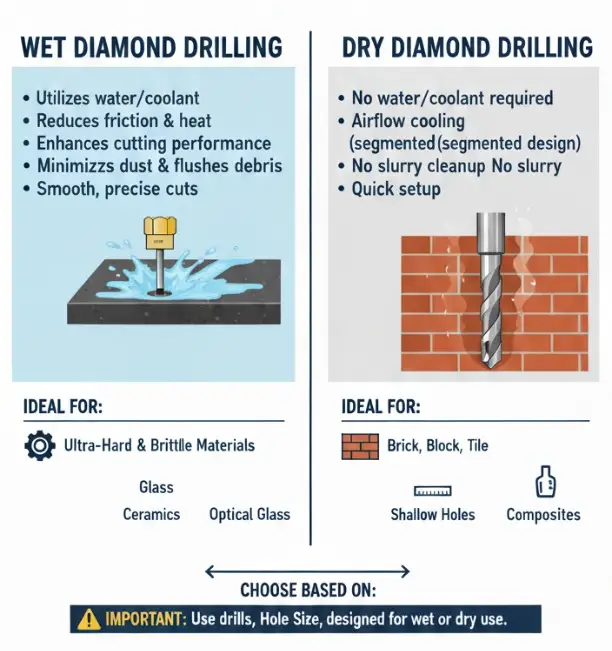 Choosing between wet and dry drilling largely depends on the type of material, the hole size and depth, and the specific project requirements. Wet drilling is generally favored for harder materials, larger holes, and tasks that require a polished finish, as it improves tool life and reduces heat. Dry drilling, on the other hand, is suitable for softer materials, shallow holes, and situations where portability and quick setup are priorities.