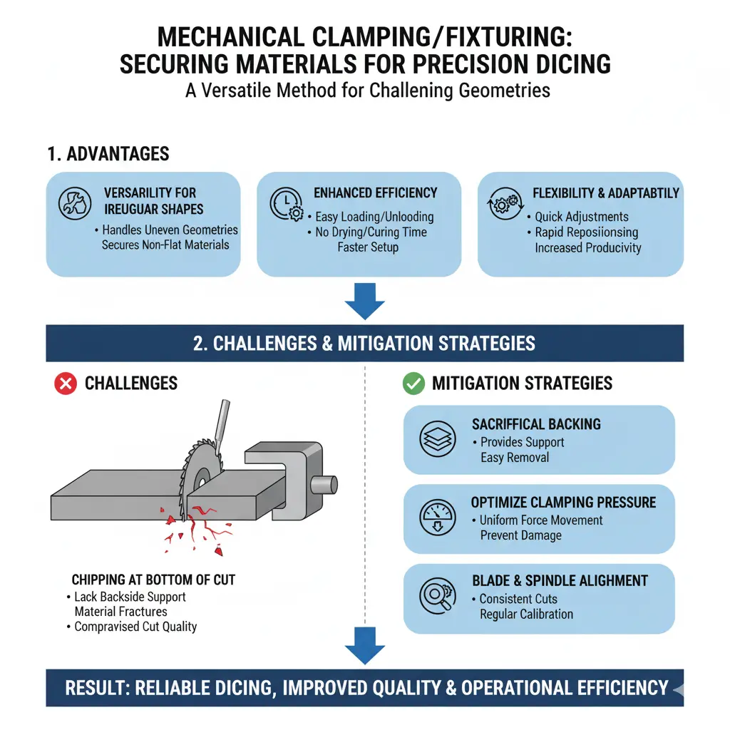 One of the primary advantages of mechanical clamping is its versatility in handling materials with irregular shapes. When the geometry of the material is uneven, mechanical clamps can be adjusted to hold the material securely, ensuring it remains stationary during the dicing process. This adaptability makes mechanical clamping a preferred choice for a wide range of applications, including those where traditional mounting methods are impractical.