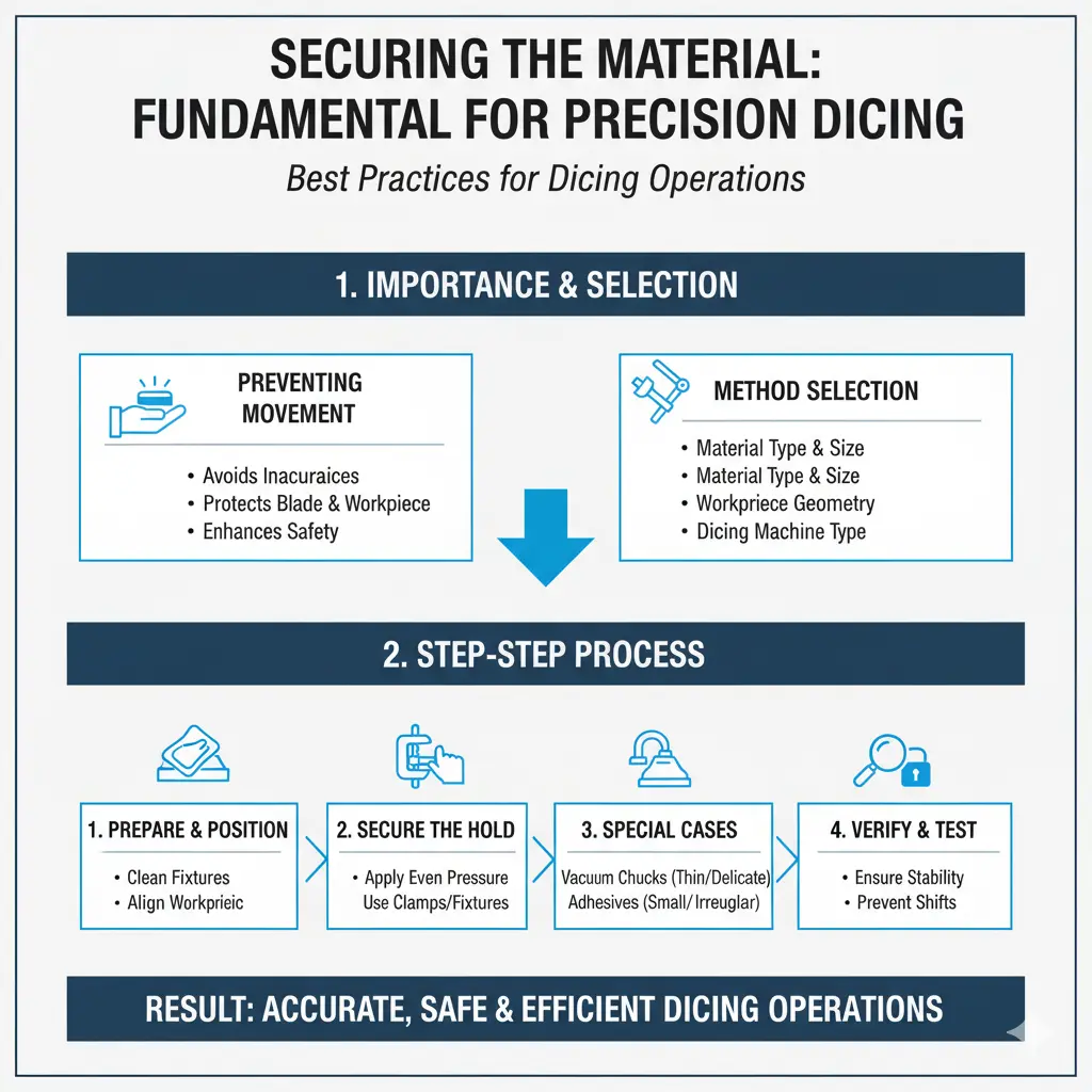 Securing the material correctly is fundamental to prevent movement during cutting, which can lead to inaccuracies, blade damage, and compromised safety. The method of securing the material depends on the type and size of the workpiece, as well as the dicing machine being used.