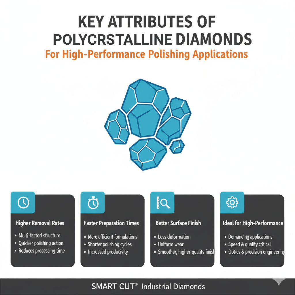 • check icon Polishing Rate: If rapid stock removal is required, polycrystalline diamonds are preferable. Monocrystalline diamonds offer a more controlled polishing rate, suitable for smooth finishes.