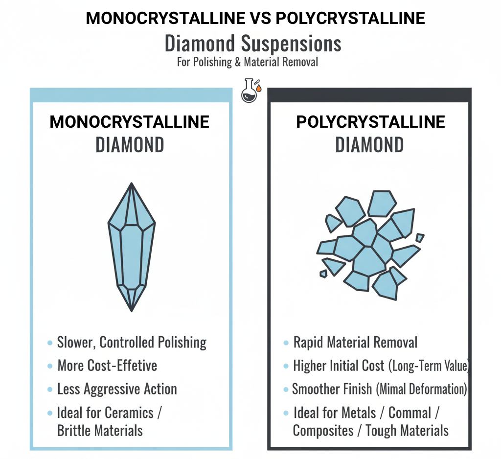 • check icon Polishing and Grinding: In diamond suspensions, monocrystalline diamonds are valued for their durability and sharpness, providing effective abrasive action for polishing and grinding.