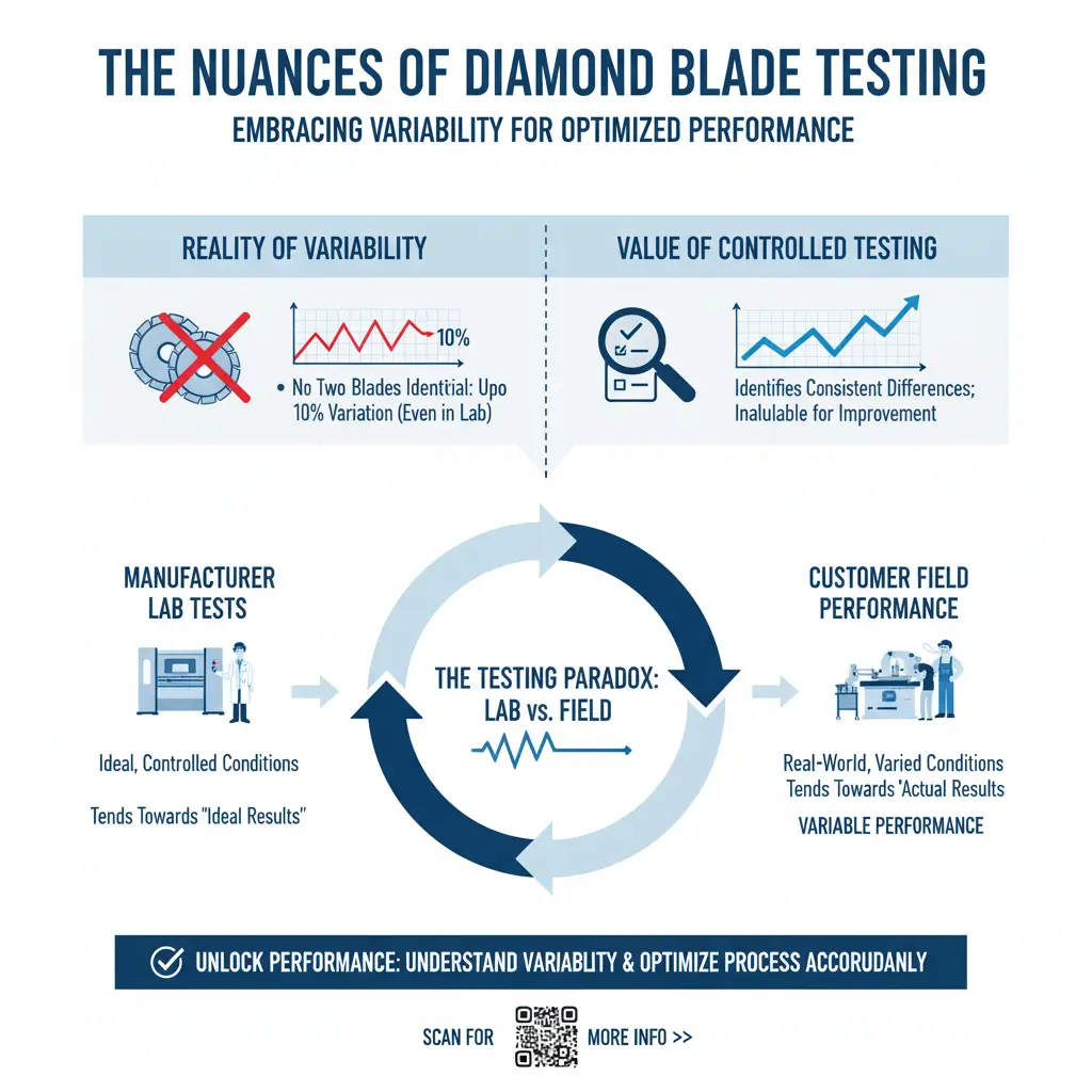 All diamond blade manufacturers do a certain amount of testing of their own products. In order to improve existing products, develop new products, compare against competition and etc. Each blade manufacturer typically uses their own methodology and hence different manufacturers may produce various results.