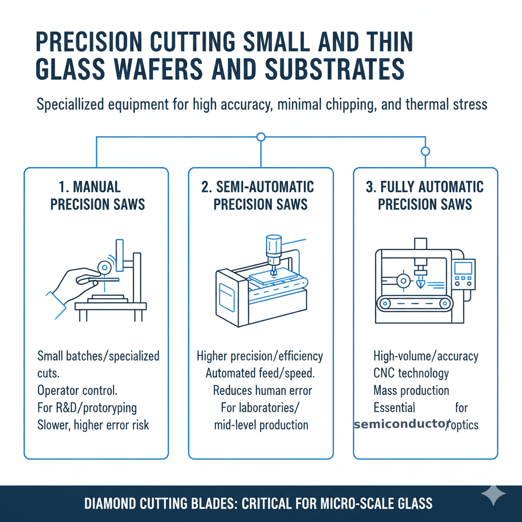 Diamond cutting blades have long been used for cutting large variety of glass such as soda lime and borosilicate glass, optical glass such as fused silica and bk7, quartz and pyrex. The material can be of almost any thickness, dimension, and shape.