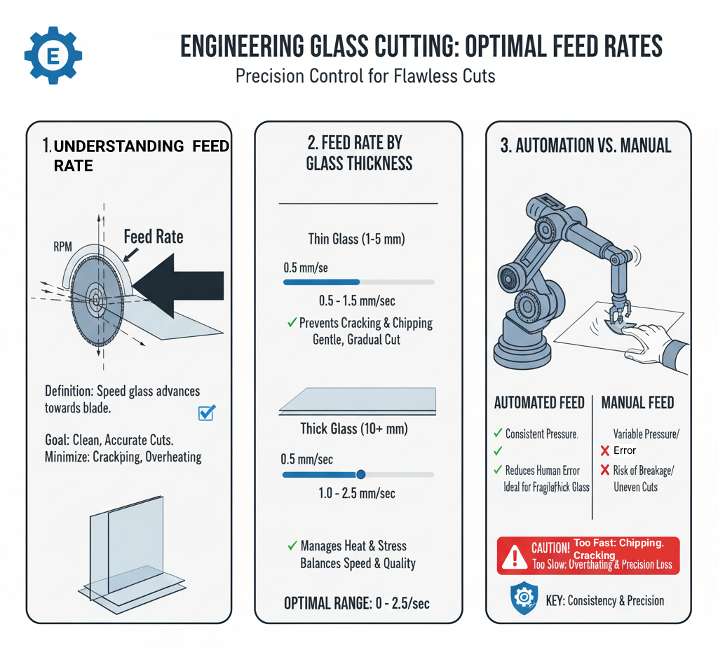 Feed rates refer to the speed at which the glass is advanced towards the cutting blade during the cutting process. Proper feed rate management is essential to ensure clean, accurate cuts while minimizing the risk of cracking, chipping, or overheating the glass. The feed rate varies depending on the thickness and toughness of the glass, as well as whether the cutting process is automated or manual.