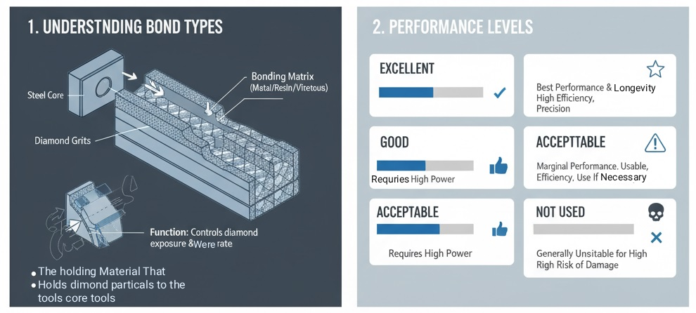 The bond type holds the diamonds in place and affects cutting performance. Soft bonds are suited for hard materials like glass. |
