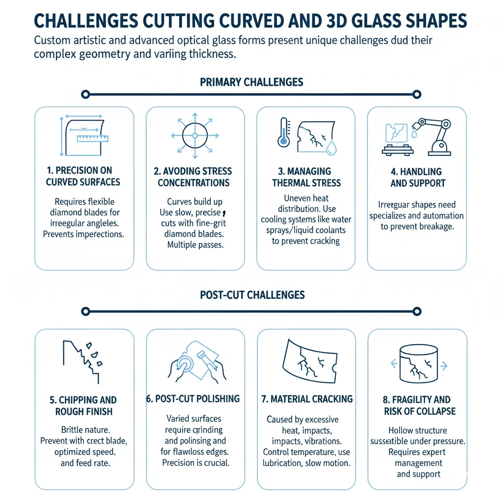 The size, thickness, and shape (e.g., flat, curved, irregular) of the glass material influence the cutting process and blade choice. |