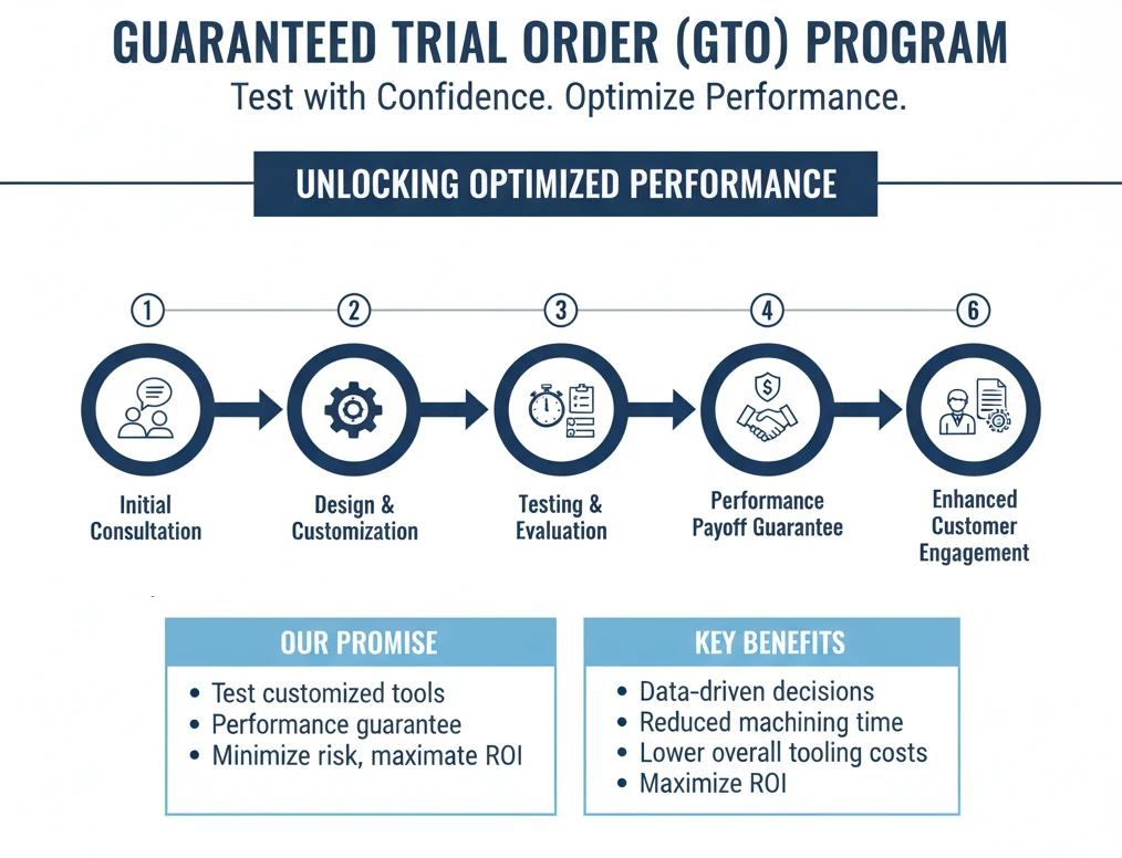The GTO Program offers the opportunity to test our customized tools under real working conditions, allowing you to directly compare their performance against your current tools. With our performance guarantee, you are not committed to a purchase unless the tool meets your expectations. If the tool does not meet the specified performance criteria, you will only pay for the relative value of the tool based on its performance.
