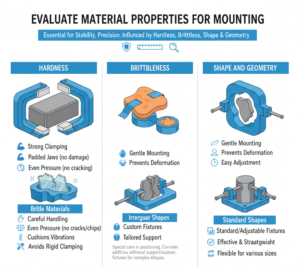 Evaluating material properties is essential when selecting the appropriate mounting or fixturing method. Key properties such as hardness, brittleness, and the material's shape and geometry influence the choice of mounting method to ensure stability, precision, and protection during the cutting or machining process.