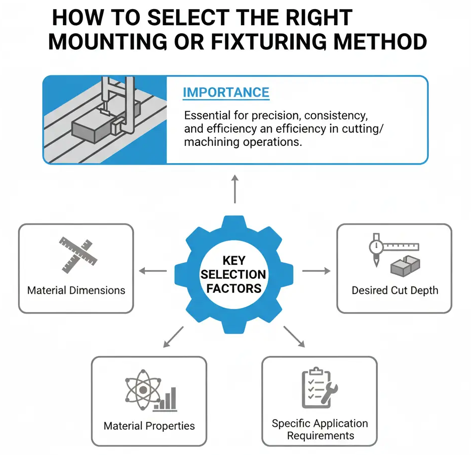 Selecting the appropriate material mounting or fixturing method is essential for achieving precision, consistency, and efficiency in your cutting or machining operations. The choice depends on several factors, including material dimensions, desired cut depth, material properties, and specific application requirements.