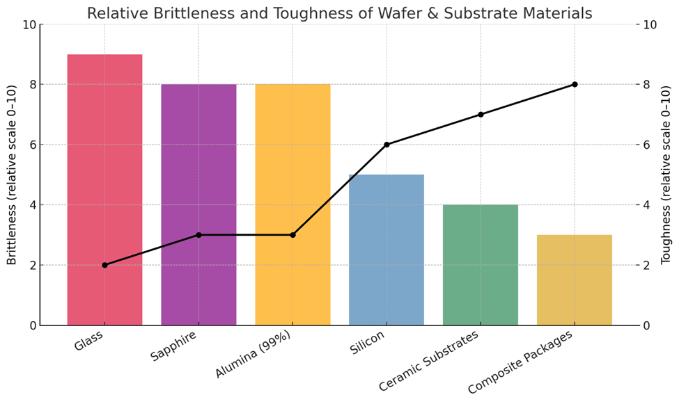 The brittleness and toughness of the material define how it responds to the stresses of dicing, whether cutting wafers, substrates, or microelectronic packages.