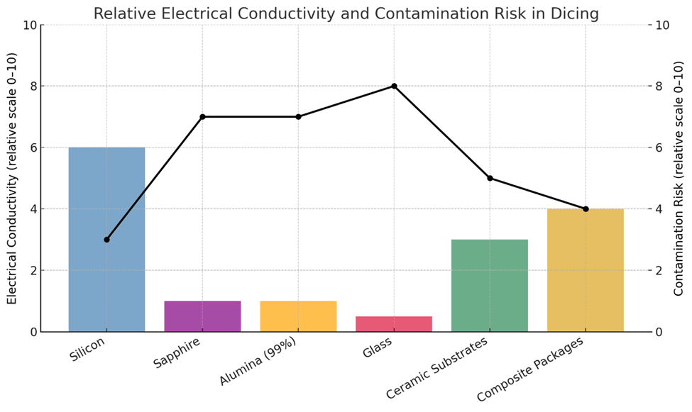 The electrical conductivity of the material can affect downstream packaging steps, especially where residues or conductive debris may interfere with device performance. When conductive particles generated during dicing remain on the wafer surface, they can create shorts, weaken insulation, or compromise the integrity of wire bonding, flip-chip attachment, or molding compounds. Even small amounts of contamination can reduce device reliability or yield.