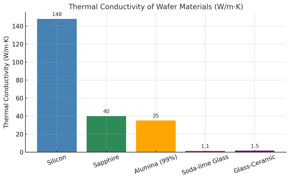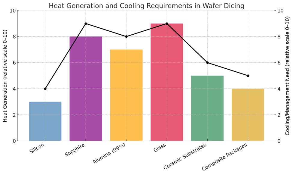 The thermal conductivity of the wafer material plays a decisive role in process stability. High conductivity materials, such as silicon, dissipate heat away from the cut zone efficiently, allowing blades to operate at higher feed rates with lower risk of thermal stress. In contrast, low conductivity materials like glass, sapphire, or certain ceramics trap heat at the cutting interface. This localized buildup increases the risk of thermal damage, blade loading, and wafer warpage.