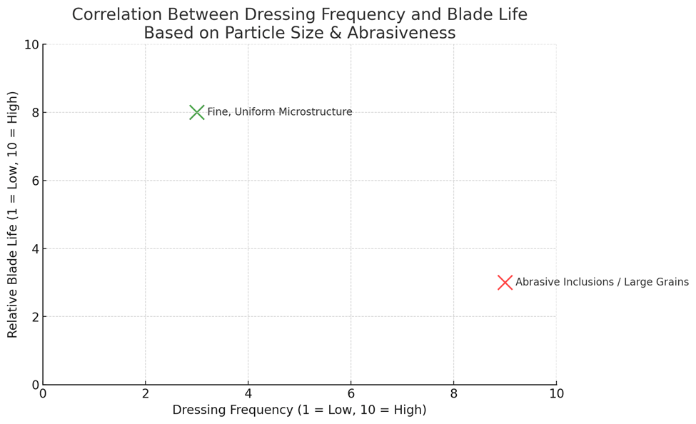 Grain size and homogeneity of the substrate affect how the blade engages the material. Large or uneven particles increase chipping and dressing frequency. |