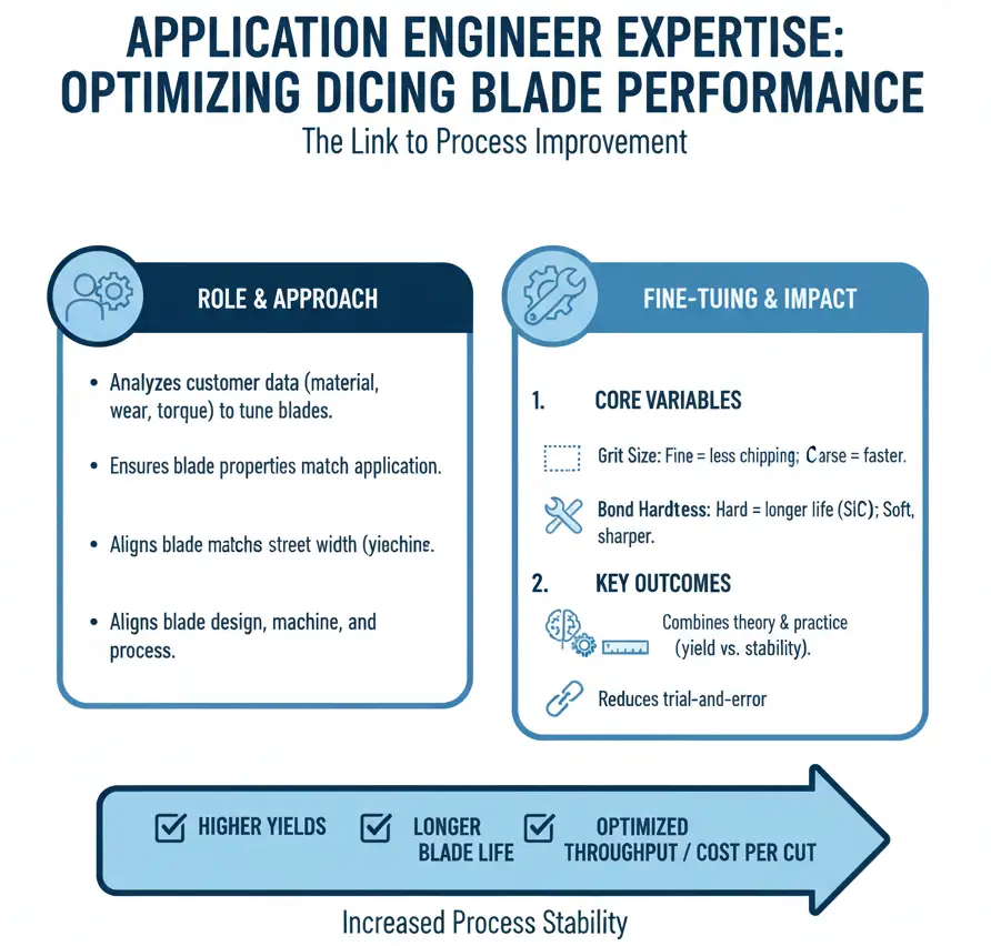 Clear communication from the user is critical. Without accurate details about the application such as wafer or package type, thickness, mounting method, coolant setup, feed rates, spindle speeds, and observed cut quality the manufacturer cannot provide meaningful recommendations. Missing information can delay troubleshooting and lead to higher costs in both time and yield loss.