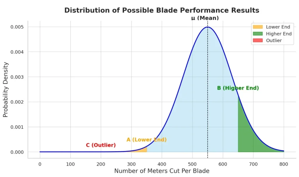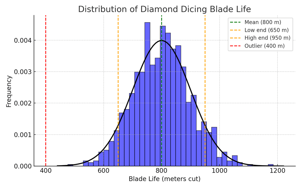A common challenge for application engineers is addressing customer concerns when blade life appears shorter than expected. For example, in a process where the average blade life is 800 meters cut, the distribution may show normal results between 650 and 950 meters. If a blade only lasts 600 meters, it is on the low end but still within normal statistical variation. Customers may view this as unacceptable, but technically the blade is performing within the expected range.