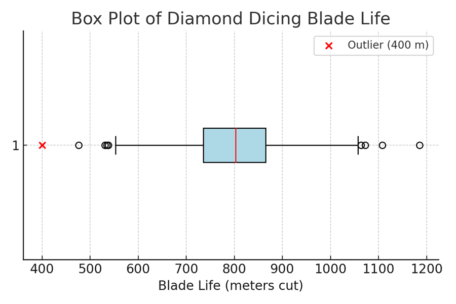 Conversely, if a blade lasts only 400 meters cut, it falls outside the normal distribution curve. Such an outlier indicates an assignable cause, such as incorrect mounting, excessive feed rate, poor coolant delivery, or in rare cases a defective blade. Identifying the root cause requires joint investigation by the manufacturer and user, since both blade properties and process setup can produce abnormal results.