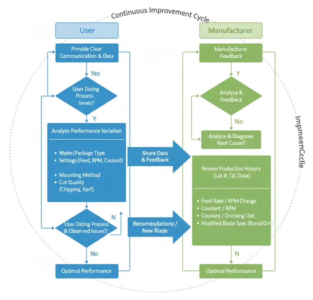 When dicing blade performance falls below expectations, it is essential for both the end user and the blade manufacturer to work together openly to identify the root cause. A cooperative approach ensures that problems are addressed quickly and effectively, rather than creating unnecessary conflict.