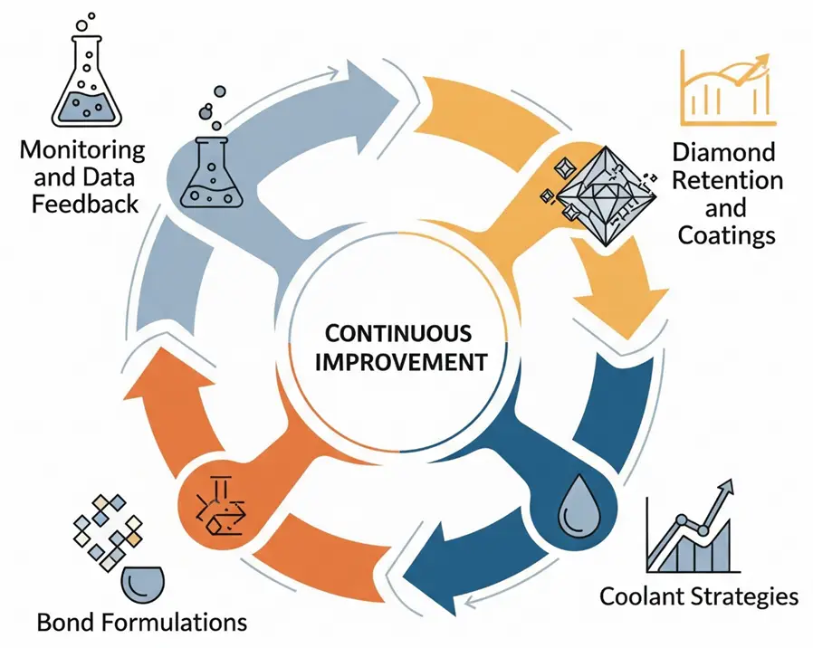 Set acceptance bands in meters per blade that reflect the three sources of variation. Escalate when a result falls outside the band, not simply because it is below the mean. With any blade return, request or provide torque logs, coolant settings, mounting details, and total meters cut. With any material change, provide lot identifiers, thickness, and stress history. This shared evidence lets the application engineer adjust grit size, concentration, or bond hardness with confidence.
