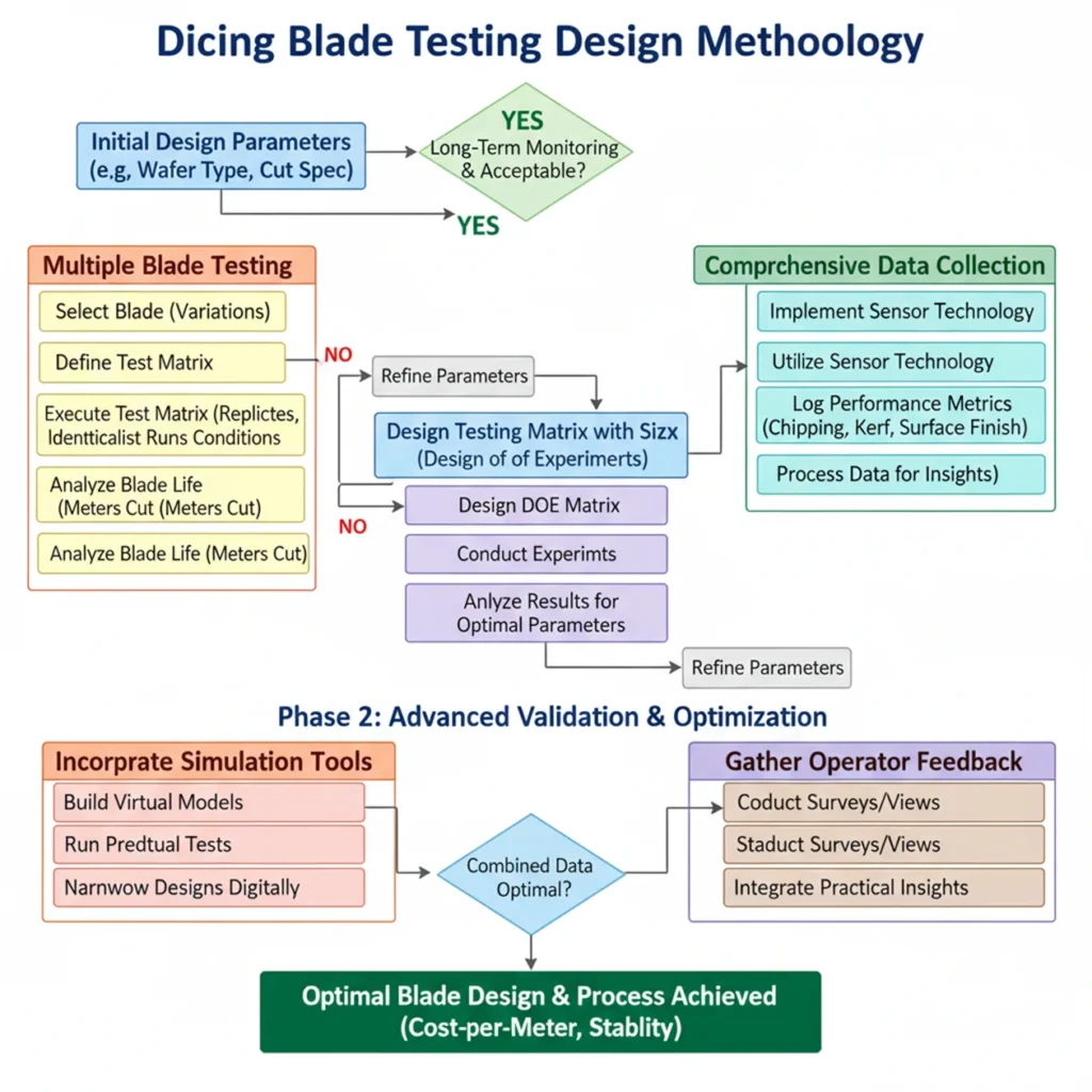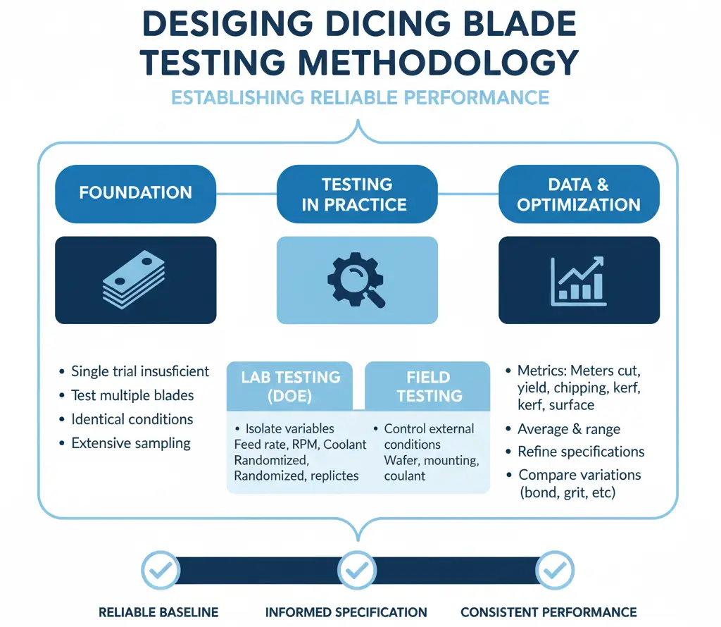 In controlled laboratory environments, statistical methods such as DOE (Design of Experiments) help isolate the influence of individual variables. Randomized testing and replicates reduce noise and provide clarity on how feed rate, spindle RPM, or coolant delivery affect blade life and cut quality. Field testing, on the other hand, requires tight control of external conditions. Standardizing wafer thickness, mounting methods, and coolant chemistry ensures that observed differences come from the blade itself rather than uncontrolled process drift.