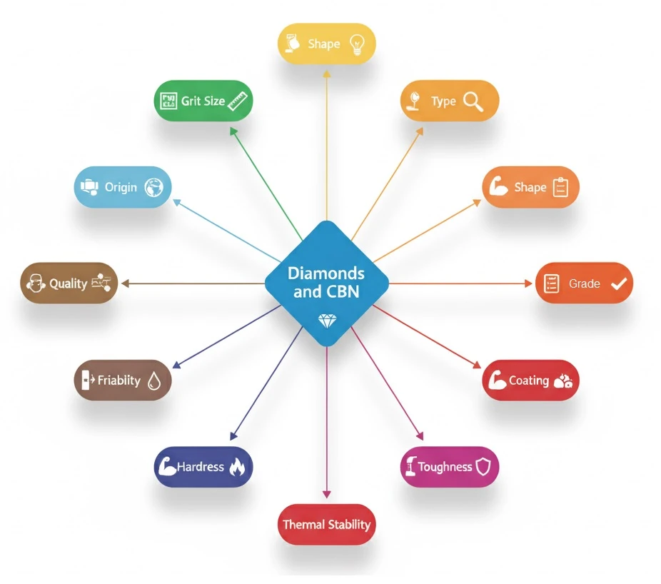 Overall composition, presence of metals or coatings, abrasiveness, hardness, and reactivity with bond or coolant |