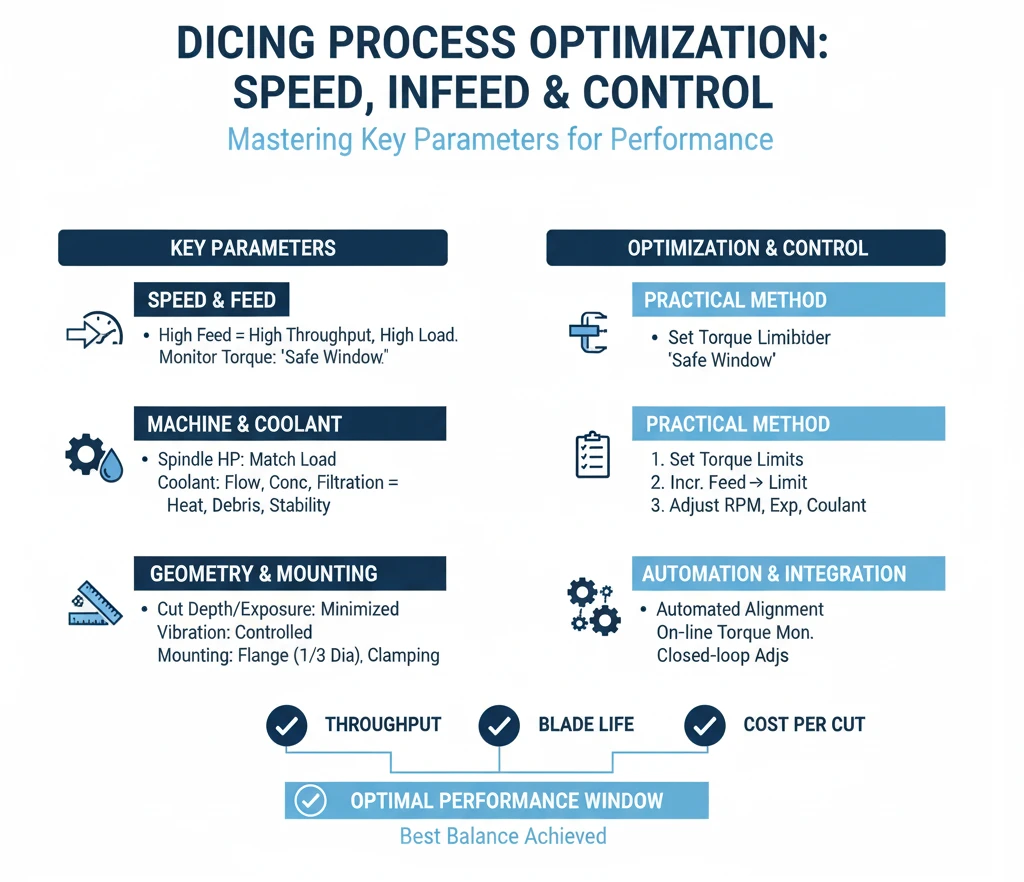 Optimization requires aligning grit size, bond type, feed rate, and coolant flow to the mechanical behavior of the material. For brittle wafers or packages, the focus is on reducing crack initiation and propagation. For tougher substrates, the goal is maximizing throughput while maintaining stable blade wear and torque levels.