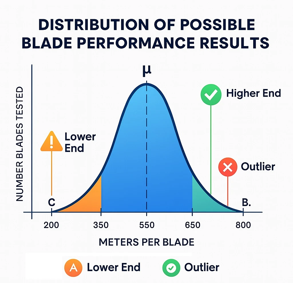 Assume the qualified process shows an average blade life of 1,500 meters cut per blade for a specific substrate and recipe. A single blade that reaches 1,050 meters may feel disappointing. It can still be inside the expected distribution once you account for product, material, and operating variation. A low result inside the normal band does not prove a defective blade. The reverse is also true. A 1,950 meter result sits in the same distribution and is equally expected when conditions align.