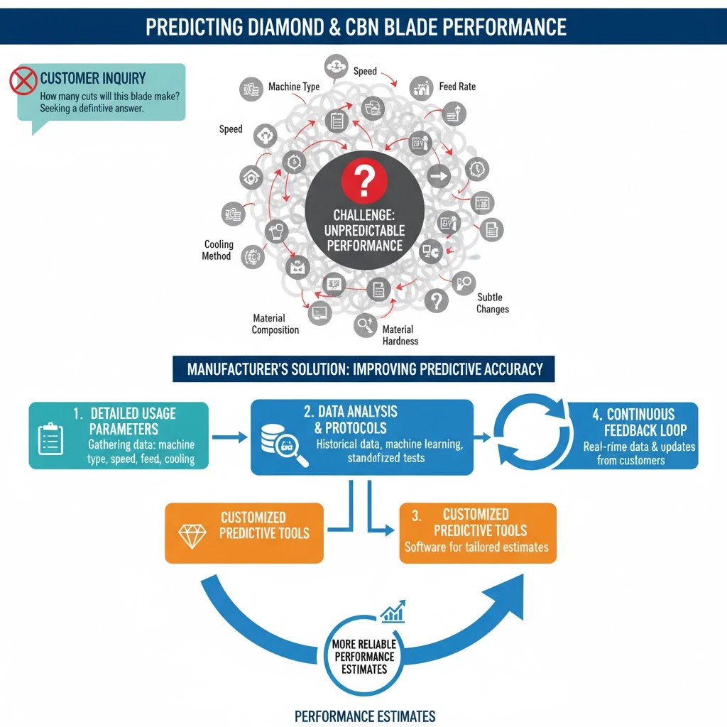 For manufacturers, providing a numerical estimate can be problematic, as customers often treat it as a performance guarantee. Instead, accurate predictions rely on collecting and analyzing detailed usage data. This includes machine type, RPM, feed rate, coolant chemistry, and the target cut quality. With this information, blade specifications can be matched more closely to real application conditions.