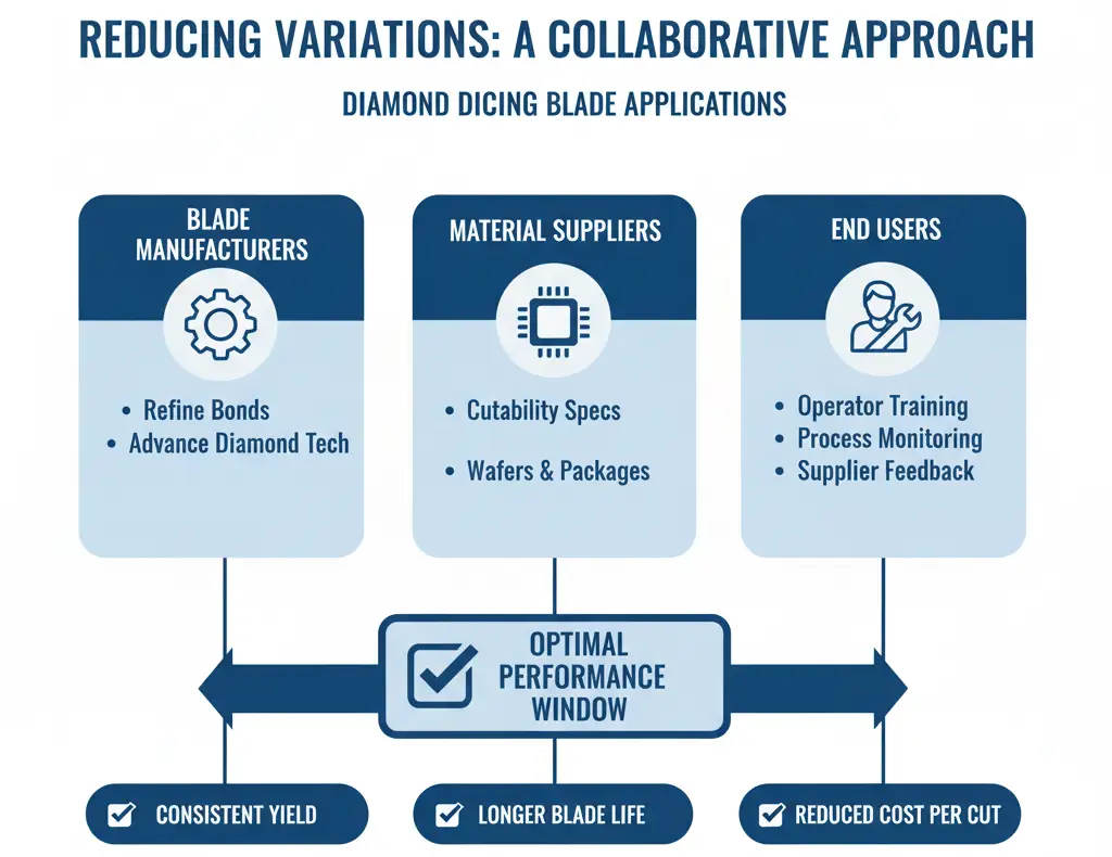 Reducing these variations requires a collaborative approach. Blade manufacturers continue refining bonds and diamond technologies. Material suppliers should incorporate cutability into their specifications for wafers and advanced packages. End users must emphasize operator training, accurate process monitoring, and strong feedback loops with suppliers. Together, this ensures dicing processes remain within their optimal performance window, delivering consistent yield, longer blade life, and reduced cost per cut.