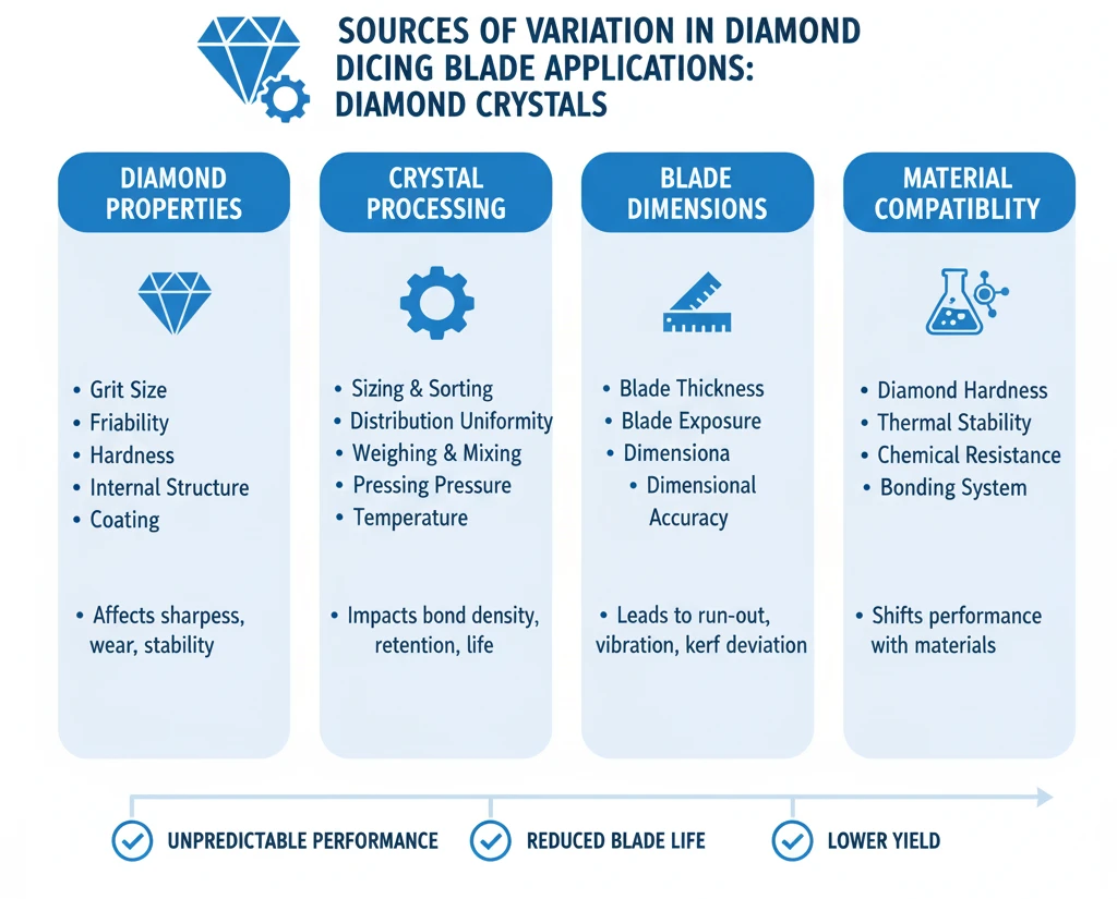 Many factors affect dicing blade performance, and controlling these variations is critical for consistent results. Blade manufacturers focus on diamond quality, sizing, concentration, and bond processing to ensure predictable behavior and repeatability in high-precision cutting. Careful control of manufacturing variables such as mixing, pressing, and thermal processing helps maintain blade stability across production runs.