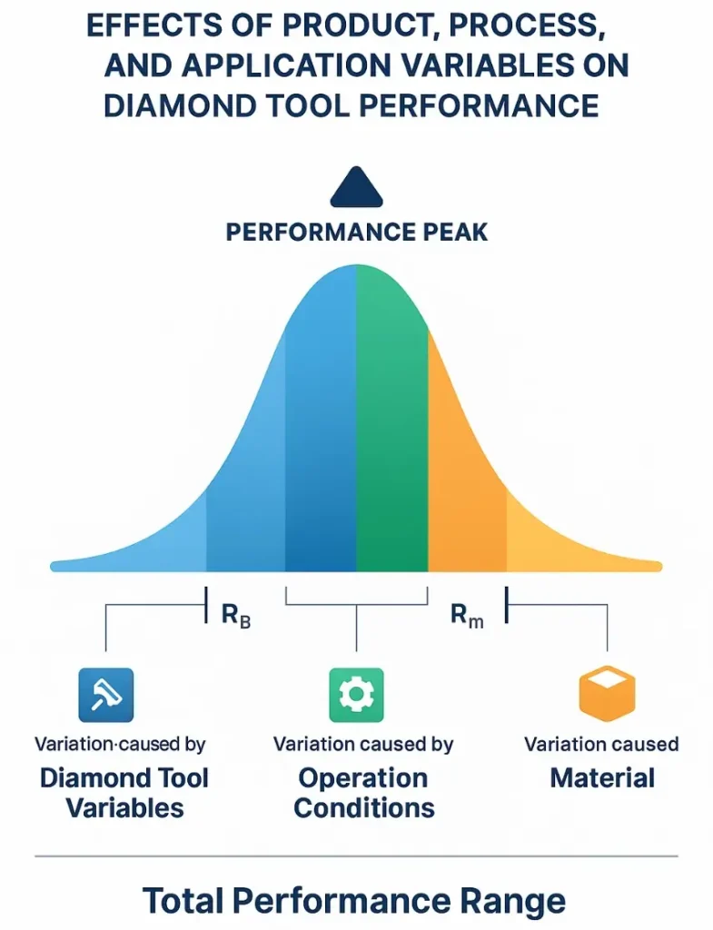 The effects of product, process, and application variables on diamond dicing blade performance are best understood through the lens of normal variation. A typical distribution curve of blade life measured in meters cut shows how results spread across influencing factors. The range labeled Rb reflects variation caused by the blade itself, including diamond grit, bond type, and concentration. Range RM represents variation from the material being cut, such as wafer hardness, brittleness, or microelectronic package structure. Range Ro captures variation from operating conditions, including feed rate, spindle speed, coolant flow, and mounting stability. While manufacturers control blade quality, these external sources of variation strongly affect performance.