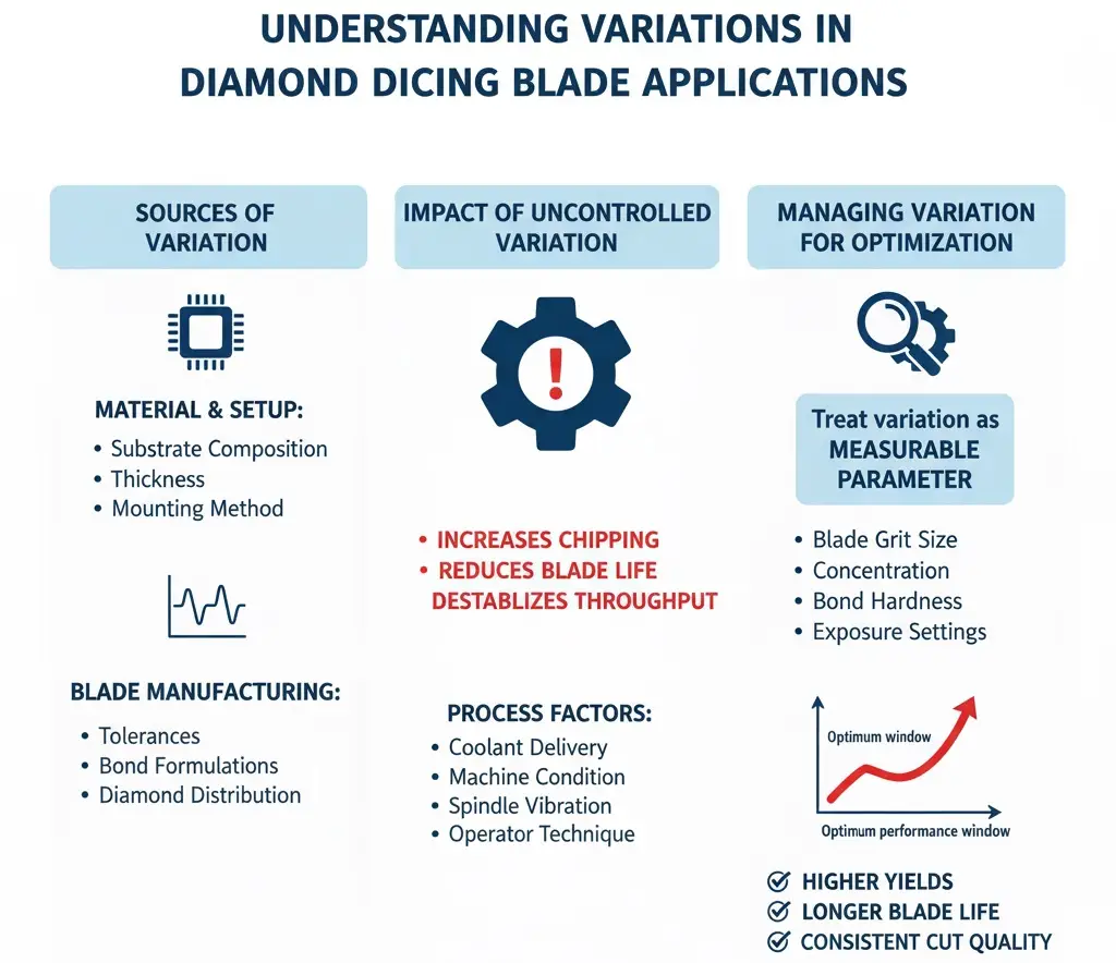 Even when blades are manufactured to the highest tolerances, process variation can still occur. Material hardness, bond strength, machine stability, coolant delivery, mounting accuracy, and operator technique all play critical roles. Just as in a mathematical equation, one incorrect variable can undermine otherwise well-selected factors, leaving the entire system inefficient. Many users approach dicing without complete knowledge of how these variables interact. This often results in setup mistakes, skipped steps, or misplaced blame directed at the blade itself when problems arise.